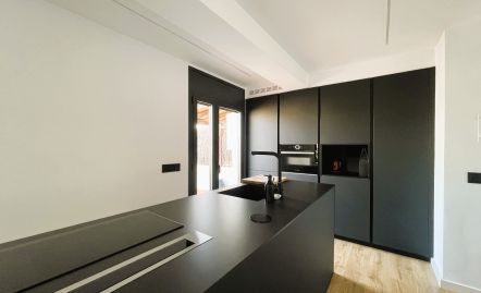 El saló-menjador és un espai acollidor i elegant, amb terres de fusta càlida que contrastin meravellosament amb els tons negres i blancs predominants en la decoració. La cuina integrada, amb una moderna illa de disseny minimalista i acabats de vi negre, no només és funcional, sinó que afegeix un toc sofisticat a l'ambient. La zona de dia s'obre directament a una terrassa espectacular d'aproximadament 30 m2, ideal per gaudir de l'aire lliure i les vistes des d'aquesta vuitena planta.